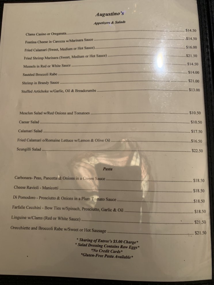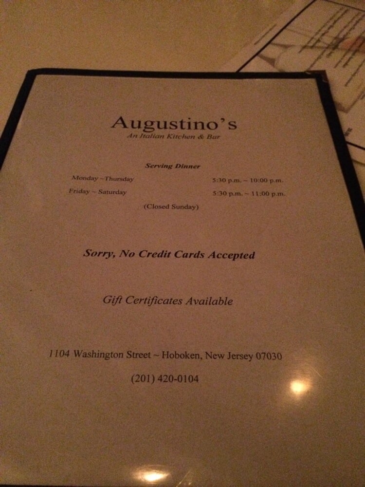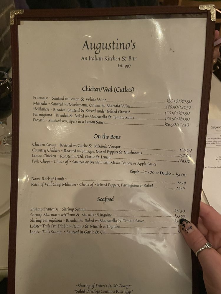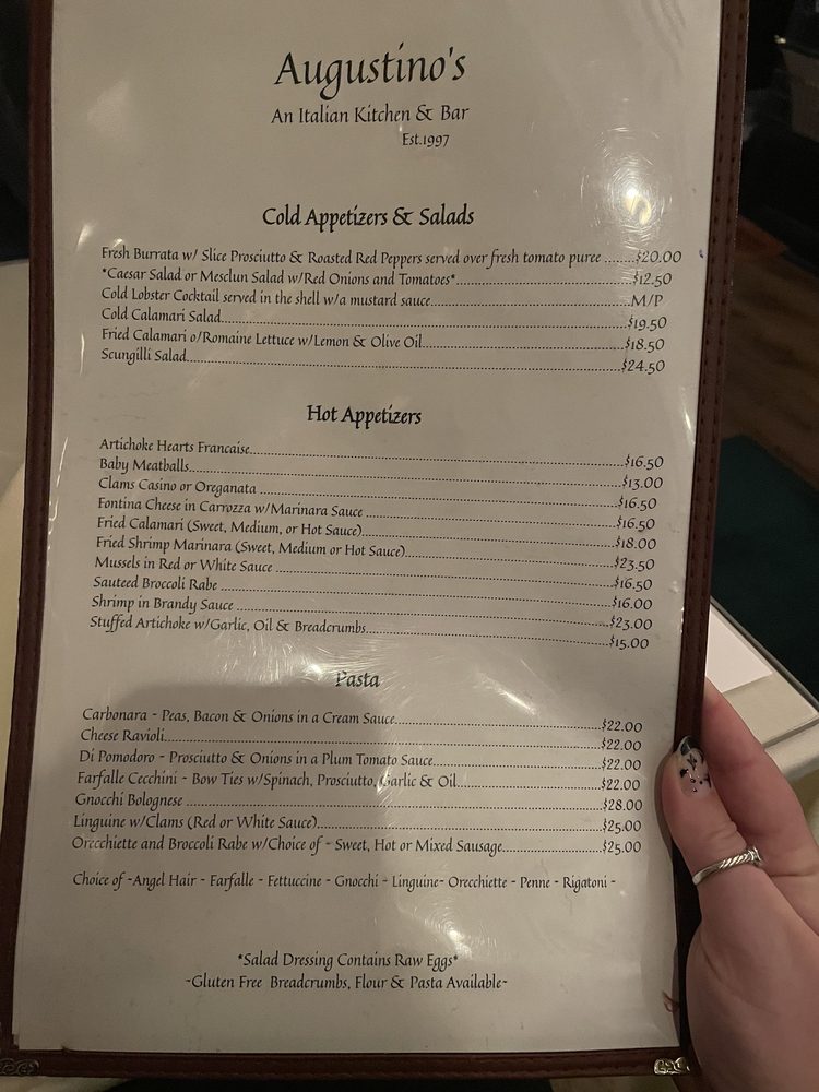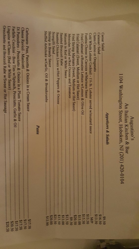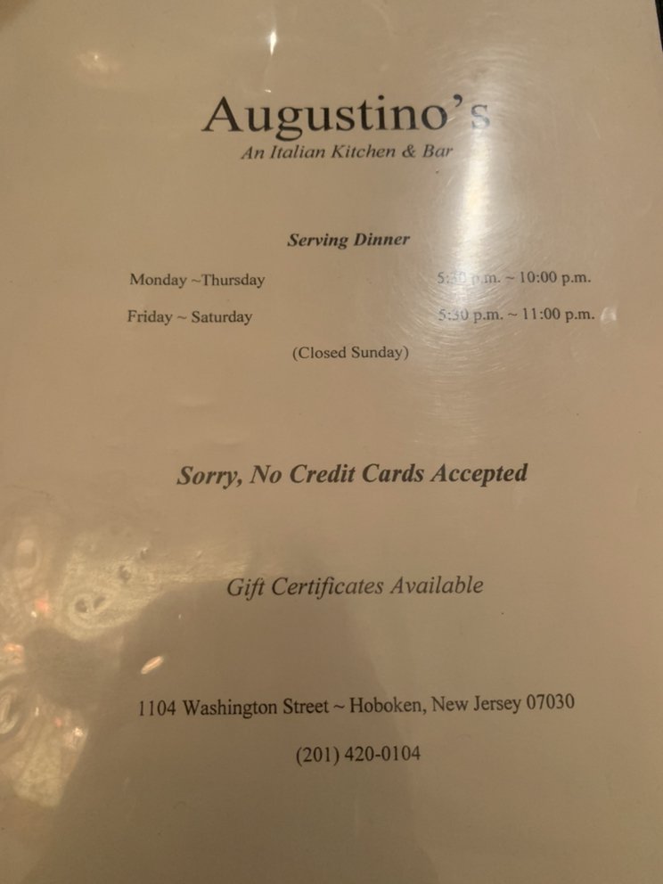 "Augustinos kitchen and bar" is a cozy, intimate Italian restaurant located at 1104 Washington St in Hoboken, NJ. With a focus on nonna's home-cooked Italian cuisine, this restaurant offers a variety of delicious dishes such as chicken parm, meatballs, linguine and clams, and lasagna. The menu features many vegetarian options and is known for its flavorful and authentic flavors. Despite its small size and limited seating, Augustinos is a popular spot for locals and visitors alike. The friendly staff, including bartenders like Denise, and servers like Ashley, provide excellent service, making diners feel welcomed and appreciated. Whether you're a longtime resident of Hoboken or a first-time visitor, Augustinos is a must-visit for a memorable dining experience.